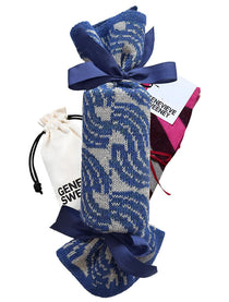 So in 2023, I created our first reusable crackers, knitted from end-of-production yarn, tied with compostable ribbons, and filled with a scented lavender bag and a surprise pair of GS socks.