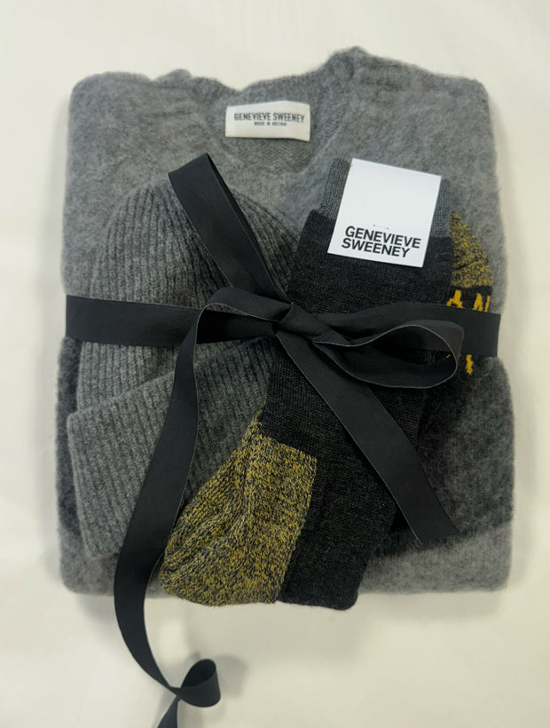 The Alford Adventure Bundle brings together three outdoor-ready yet luxurious essentials: the Alford Brushed Wool Sweater in tonal grey stripes, paired with a Grey Melange Ribbed Lambswool Beanie and our bestselling Walking Merino Wool Socks in Charcoal & Mustard.