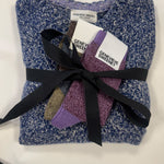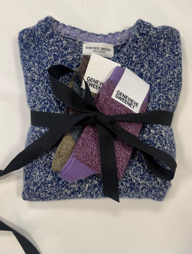 The Brook Cosy Blue Bundle brings together three of our most-loved pieces: the Brook Lambswool Jumper in blue marl, paired with two bestselling British-made socks – the Serora sparkly spiral-stripe socks in Gold & Denim Tweed and the Samar merino wool socks in Lilac.