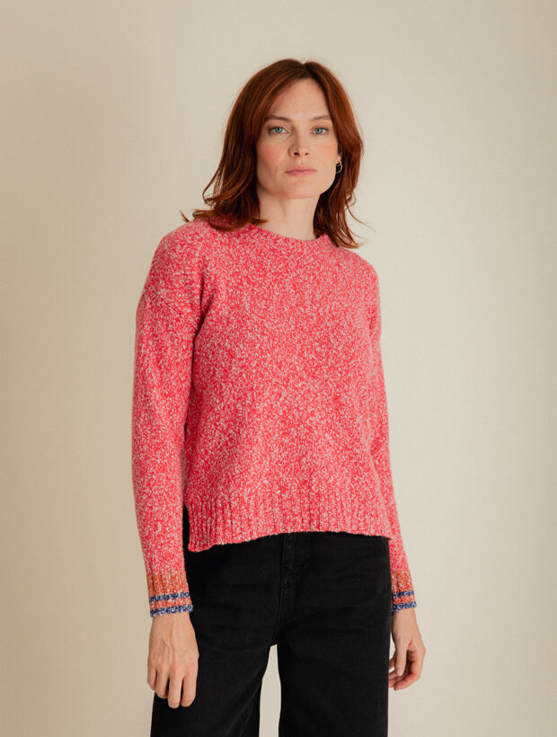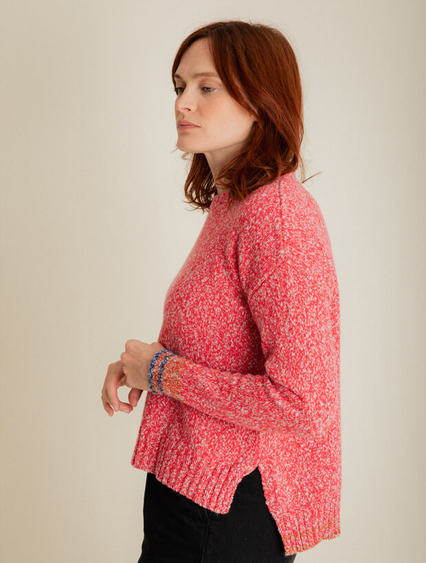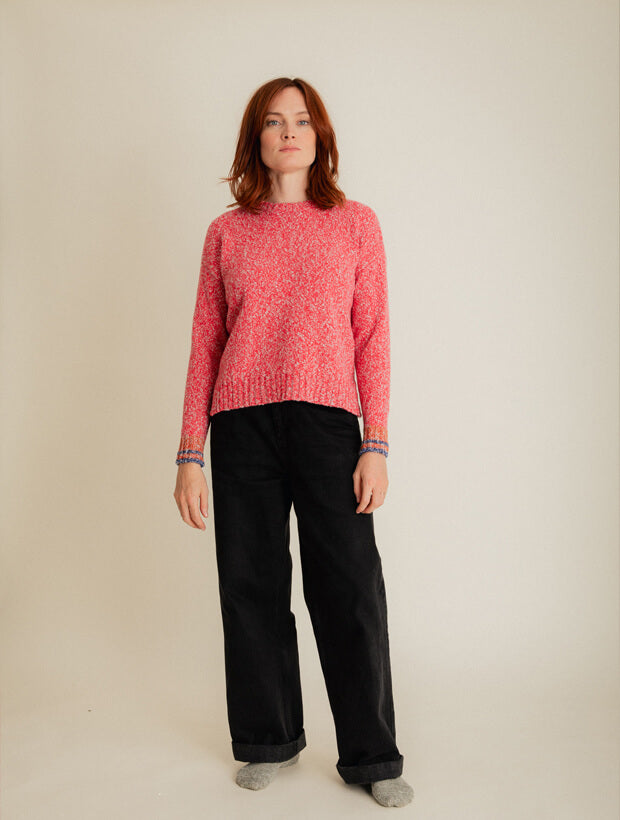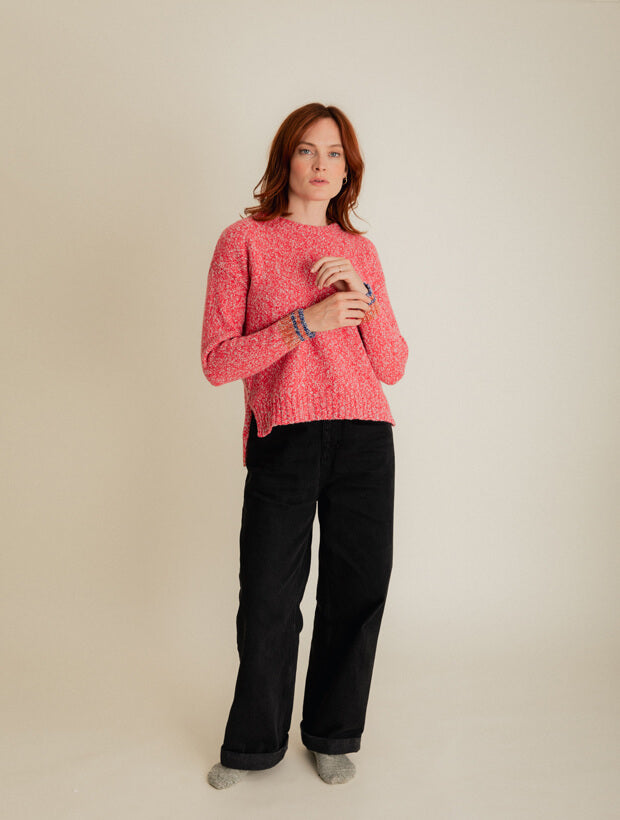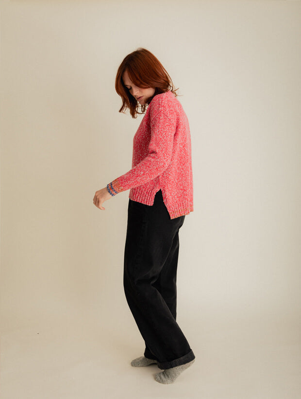 Genevieve’s hand-picked blend of vibrant pink melange with a natural textured slub lambswool creates a beautifully eye-catching duo-tone colour twist with its contrasting cuffs and back hem detail. Custom-spun in Scotland from super-fine lambswool, using a traditional slub detail, the process is incredibly slow, therefore only a limited amount is spun each year giving a soft handle and irresistible comfort.