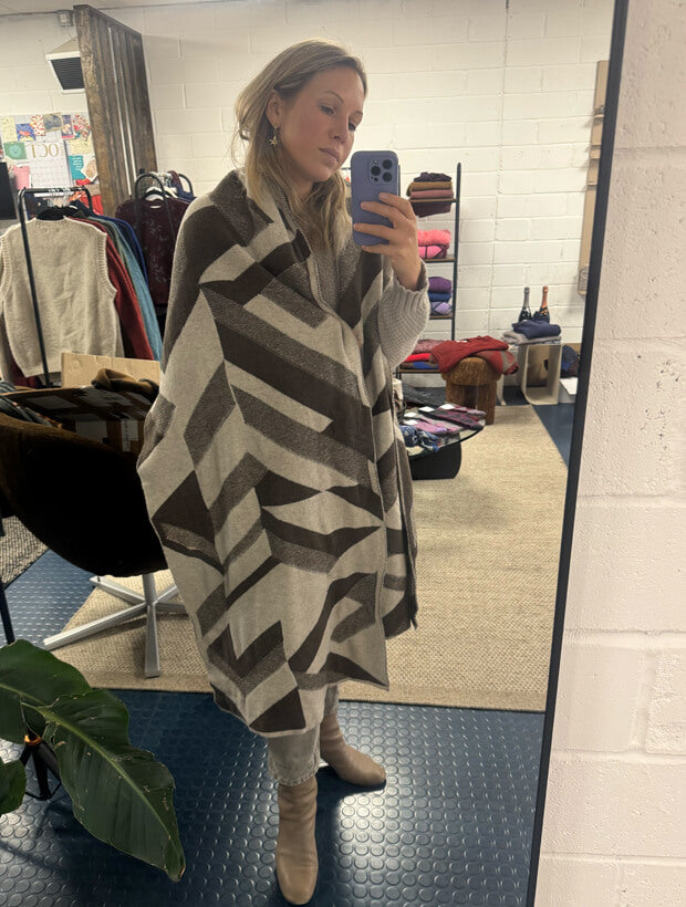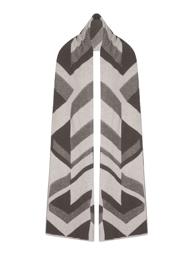 With its oversized silhouette and bold textural geometric pattern, this scarf is as versatile as it is striking. The blanket-like shape allows it to be styled in multiple ways to keep you warm and comfortable, while the jacquard knit reveals a tonal reverse — offering two looks in one.