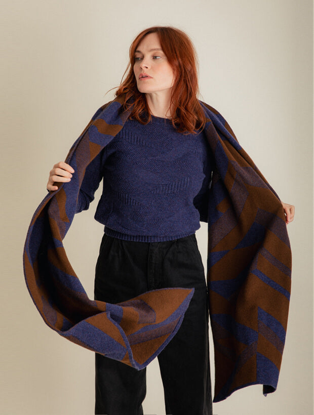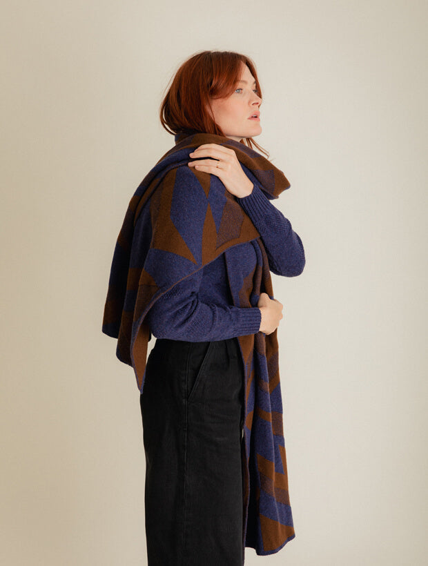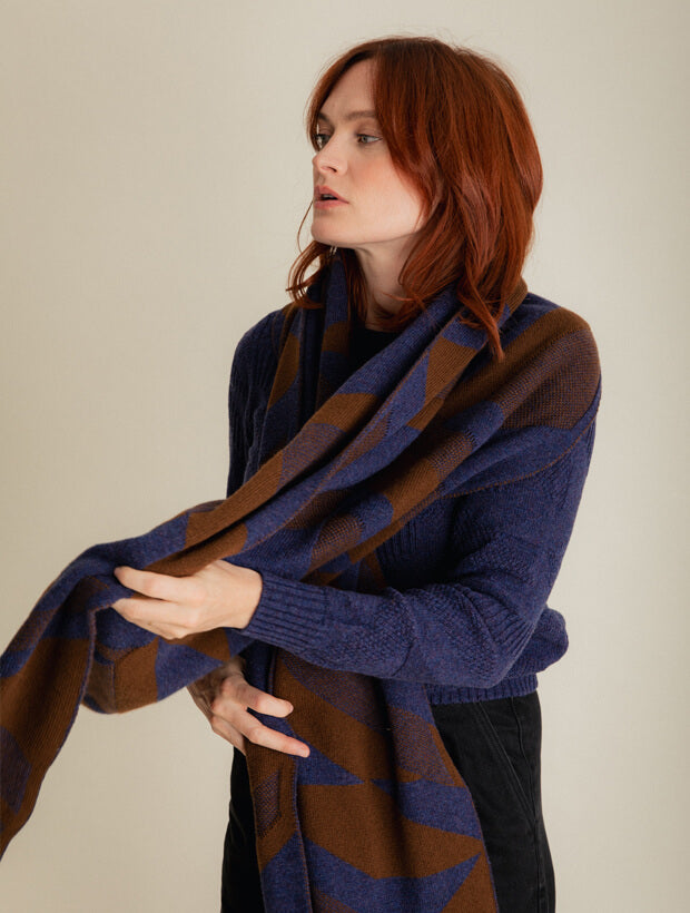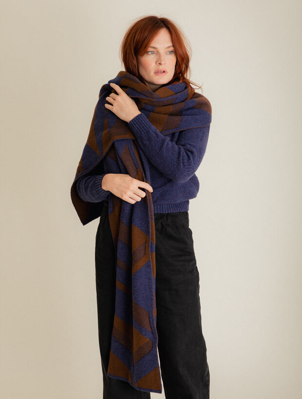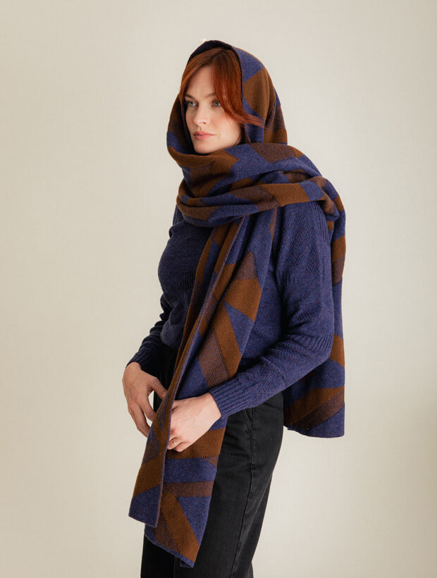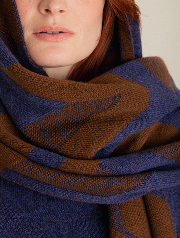 This luxurious blanket scarf introduces a striking new colour update to your winter wardrobe. Knitted in-house at our GS studio in Hertfordshire, it features a complex ink blue melange with subtle purple undertones, paired with a rich hazelnut brown. The combination creates a palette that is both grounding and sophisticated, yet unexpectedly vibrant when worn together.