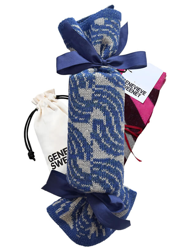 A Christmas exclusive developed by Genevieve for her fellow sock lovers, this luxury Christmas Cracker is filled with a mystery GS sock and a small lavender bag. Perfect for gifting or placing on the Christmas table as an alternative to the traditional Christmas Cracker. It’s presented in a beautiful, limited-edition reusable Christmas cracker, knitted with end-of-line production yarn in bright blue and grey melange with a subtle shimmer of sparkly green.
