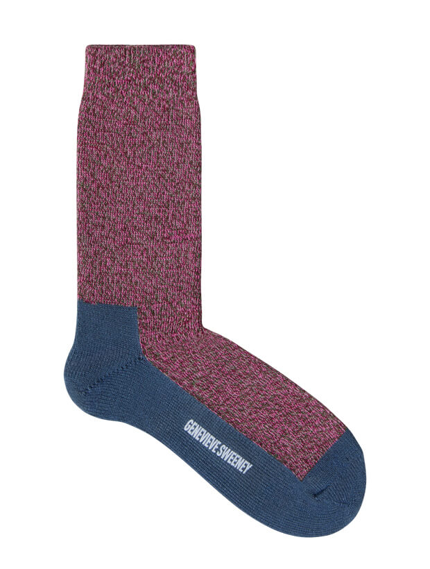 Made from soft, organic cotton, these socks are custom-spun by Genevieve herself to create a selection of totally unique colour blends – in this case rose pink, burgundy and green. These beautiful marls are then twinned with a contrasting heel, toe and cuff in a denim blue technique sole.