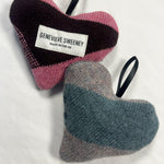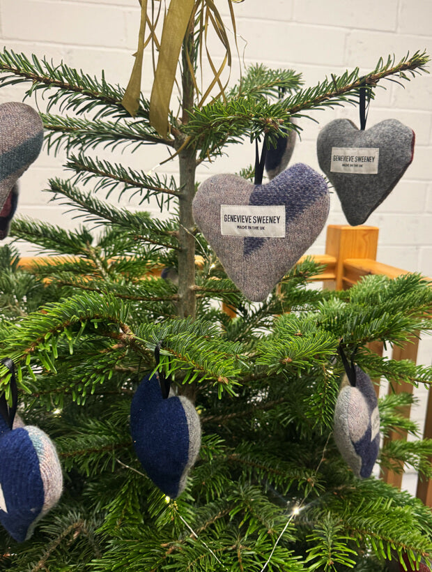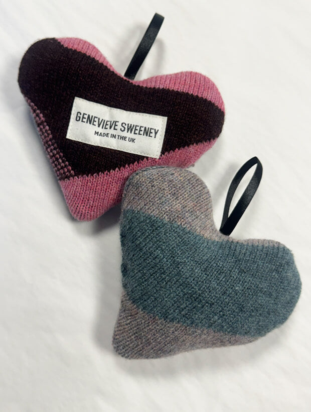 A luxury lavender and cedarwood bag in a knitted heart, created by Genevieve herself, by repurposing sample fabrics. A beautiful, heady scent for your knitwear and sock drawers, whilst being a natural moth-repellent.