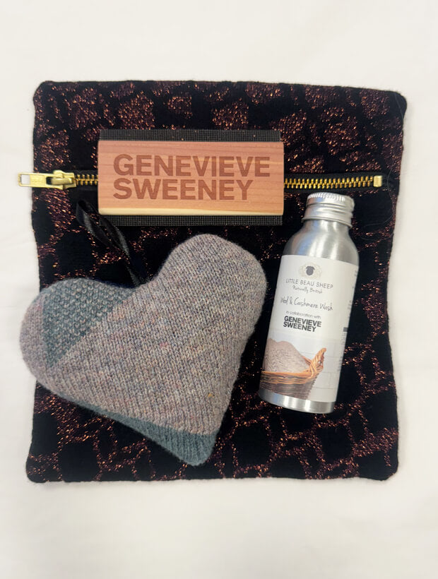 A simple and fuss-free way to care for your GS pieces with our travel kit – a product exclusively designed by Genevieve for her fellow wool lovers. This luxury kit is designed to help care for your GS knitwear, prolonging the life of your pieces and keeping them looking their best. Perfect for gifting, it’s presented in a beautiful, limited-edition GS knitted wash bag.