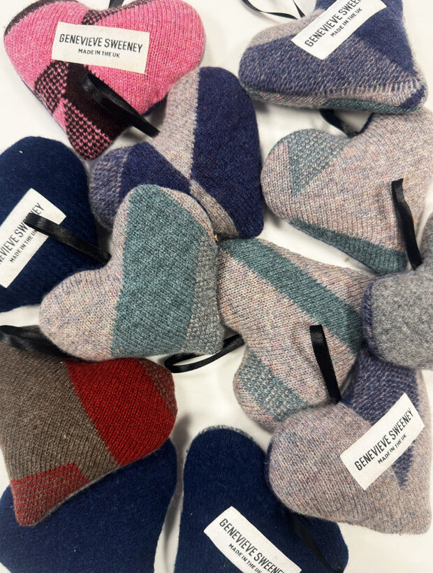 - One Lavender Heart Bags crafted from 100% lambswool repurposed knits, each one uniquely patterned and one-of-a-kind.