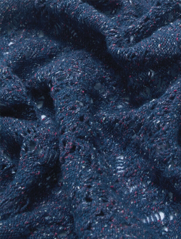 Fine flecks of silk noil in bright pink and white run through the yarn, creating a subtle confetti of colour that adds depth, texture and quiet character to the knit.