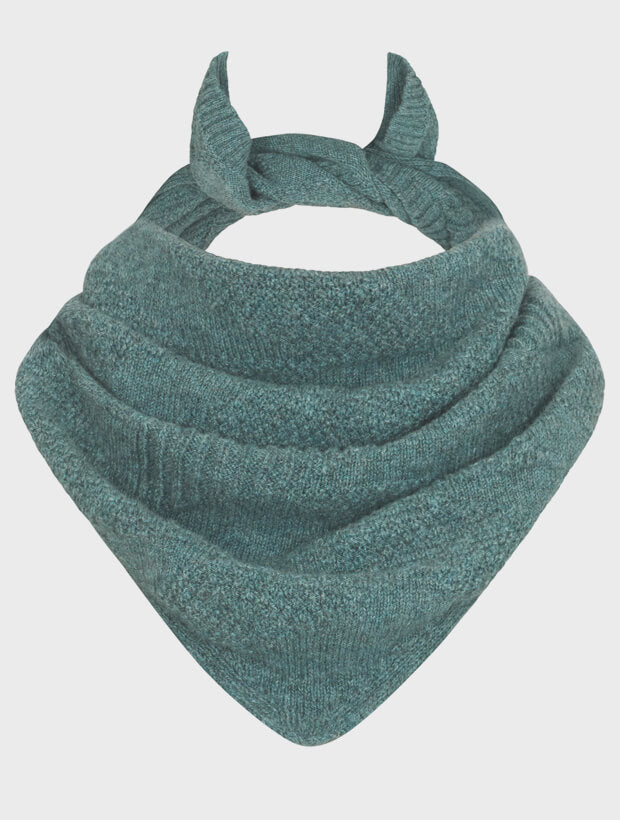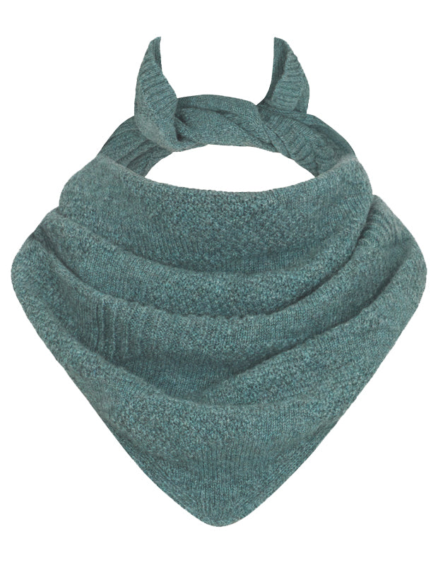 Make a statement with our textured Triangle Lambswool Scarf in a stormy Caspian green with hints of grey melange. This is the first style that has been designed, developed, and knitted in-house by Genevieve in her studio in Hertfordshire. This striking scarf is a testament to modern British craftsmanship. The large triangle shape is combined with a distinctive texture of moss stitch, rib, and knit. Fully fashioned detailing at the sides ensures a refined, elegant silhouette, while the deep melange hue adds an elegant textural detail to your capsule wardrobe.