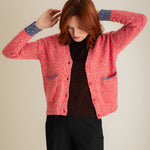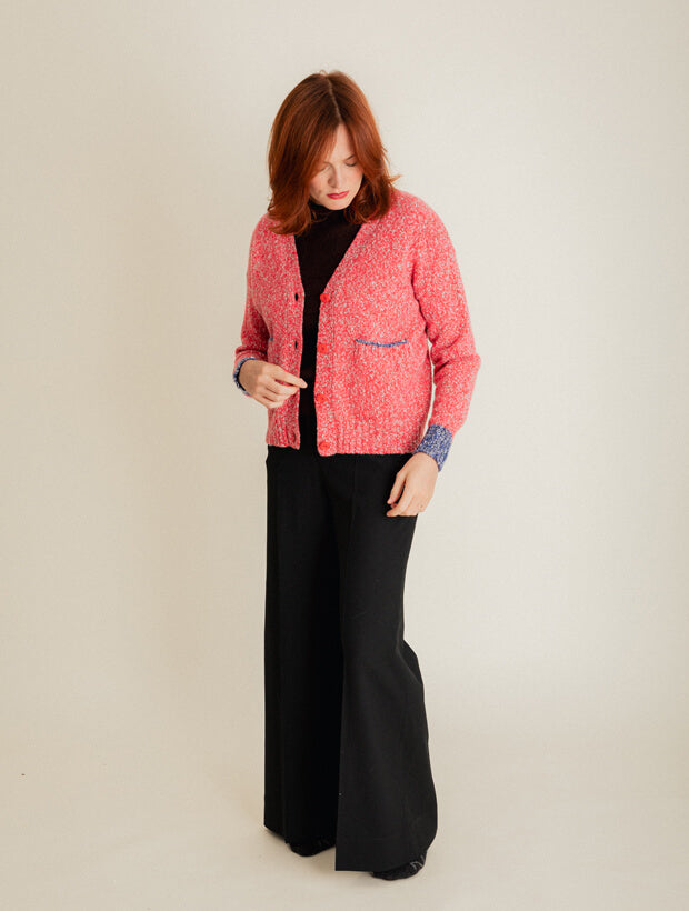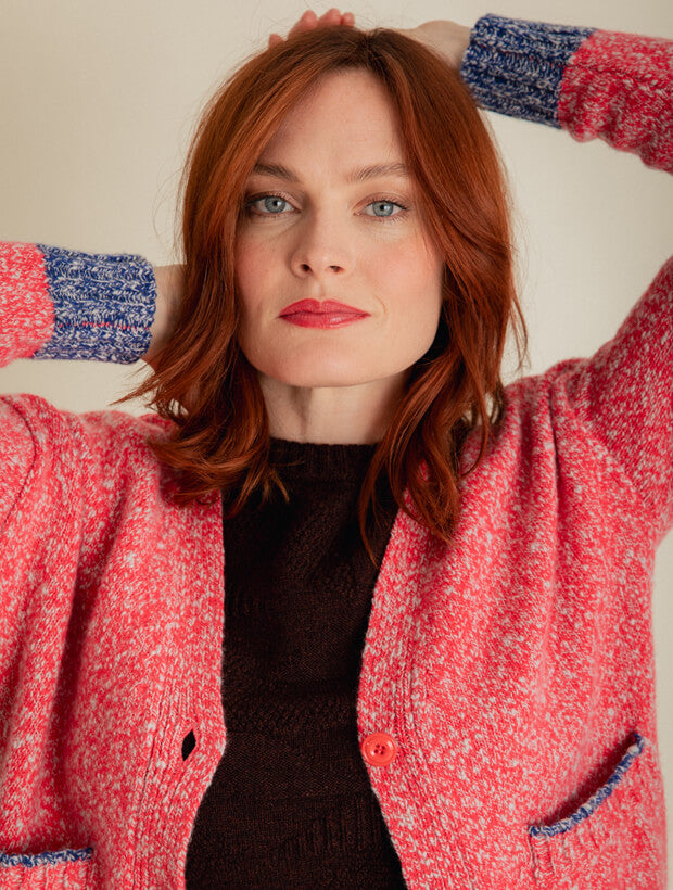The yarn used to craft our Lea cardigans is spun in Scotland from super-fine lambswool into a textured slub yarn. This is a very time-consuming process, creating an even slub whilst ensuring the highest quality finish. Due to this slow process, only a small amount of yarn is created each year. Genevieve create's custom marls to showcase the beauty of this textured slub, with a fine lambswool in a vibrant pink melange highlighting the sumptuous details of the yarn.