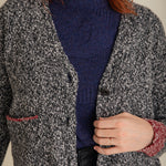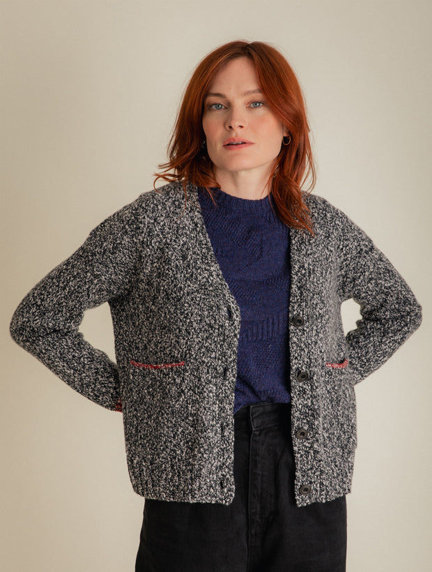 The yarn used to craft our Lea cardigans is spun in Scotland from super-fine lambswool into a textured slub yarn. This is a very time-consuming process, creating an even slub whilst ensuring the highest quality finish. Due to this slow process, only a small amount of yarn is created each year. Genevieve create's custom marls to showcase the beauty of this textured slub, with a fine lambswool in a spiced deep red melange highlighting the sumptuous details of the yarn.