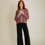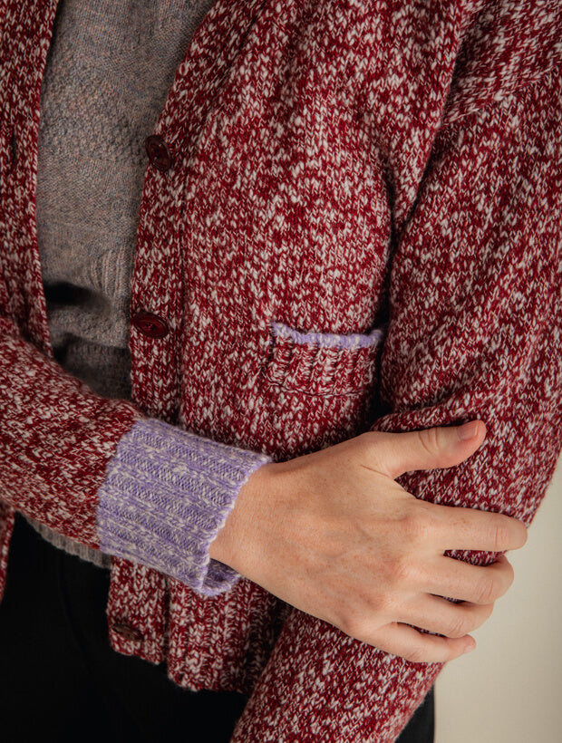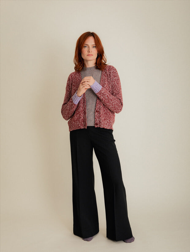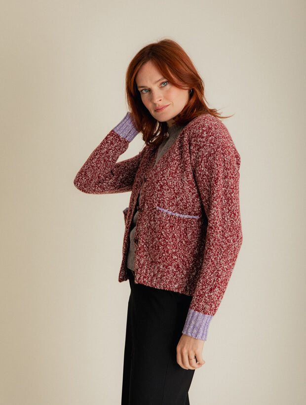 The yarn used to craft our Lea cardigans is spun in Scotland from super-fine lambswool into a textured slub yarn. This is a very time-consuming process, creating an even slub whilst ensuring the highest quality finish. Due to this slow process, only a small amount of yarn is created each year. Genevieve create's custom marls to showcase the beauty of this textured slub, with a fine lambswool in a spiced deep red melange highlighting the sumptuous details of the yarn.
