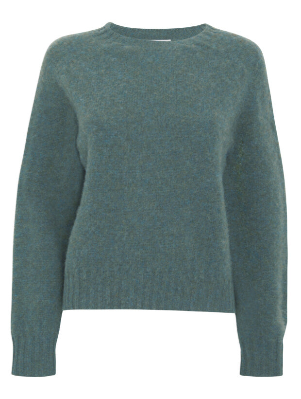 Lightweight with a contemporary cropped fit, the Leslie sweater is perfect for wearing all year round. This super soft knit is crafted from lambswool brushed with dried thistles, creating a luxurious, almost felted finish. The stormy sea green melange is highlighted with flecks of grey tones. Perfect for everyday wear, this knit can be styled with high-waisted pieces or layered beneath dungarees.