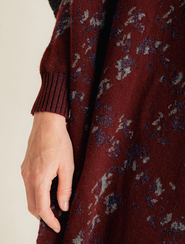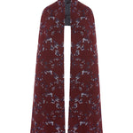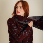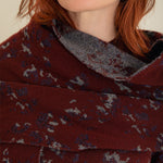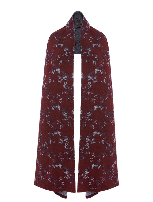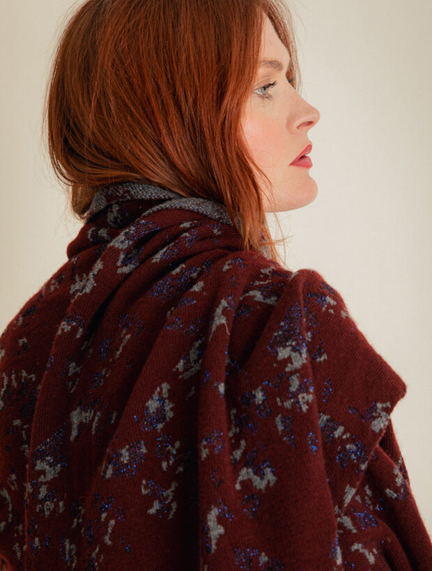 Crafted in the UK, the Lin scarf knitted in soft, fine Scottish spun lambswool with a two-colour jacquard design in burgundy and grey melange, intricately knitted with regenerative viscose in sparkling silver. The result is a timeless oversized scarf that moves seamlessly from day to evening.