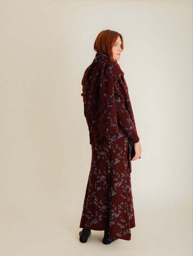 Discover understated elegance with the Lin Sparkly Lambswool Jacquard Oversized Scarf, a statement accessory from our limited-edition luxury knitwear collection. A contemporary reinterpretation of tartan, the intricate jacquard design is inspired by natural lichen mark-making and expertly knitted in the UK from soft fine lambswool in burgundy and grey melange. Finished with shimmering regenerative viscose, this oversized scarf combines heritage craftsmanship with modern sophistication.