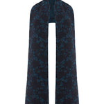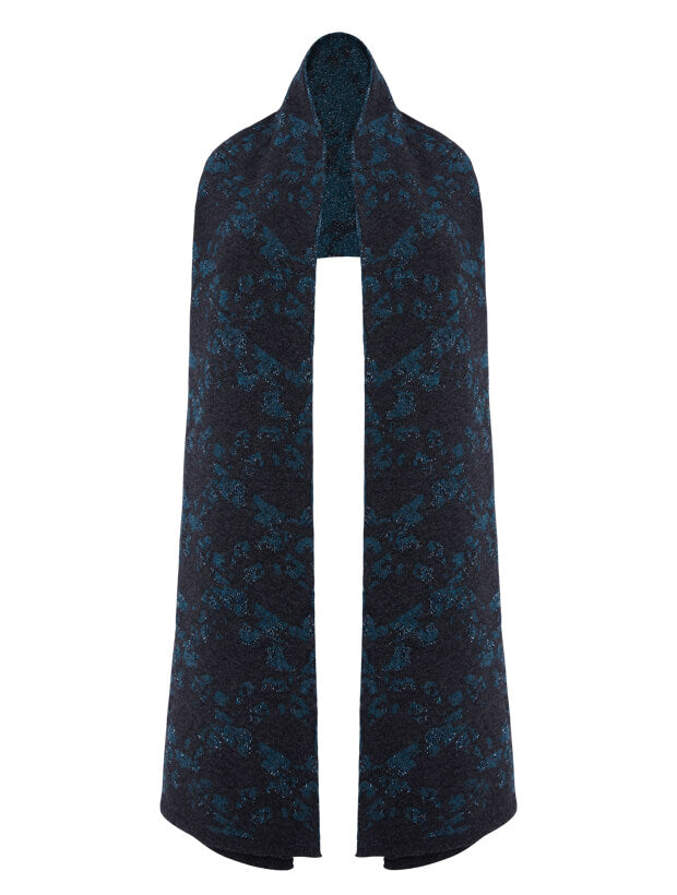 Crafted in the UK, the Lin scarf knitted in soft, fine Scottish spun lambswool with a two-colour jacquard design in charcoal grey and teal green melange, intricately knitted with regenerative viscose in sparkling silver. The result is a timeless oversized scarf that moves seamlessly from day to evening.