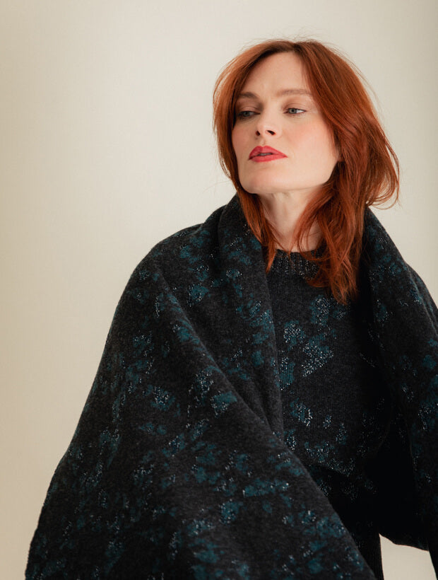 Discover understated elegance with the Lin Sparkly Lambswool Jacquard Oversized Scarf, a statement accessory from our limited-edition luxury knitwear collection. A contemporary reinterpretation of tartan, the intricate jacquard design is inspired by natural lichen mark-making and expertly knitted in the UK from soft fine lambswool in charcoal and teal melange. Finished with shimmering regenerative viscose, this oversized scarf combines heritage craftsmanship with modern sophistication.