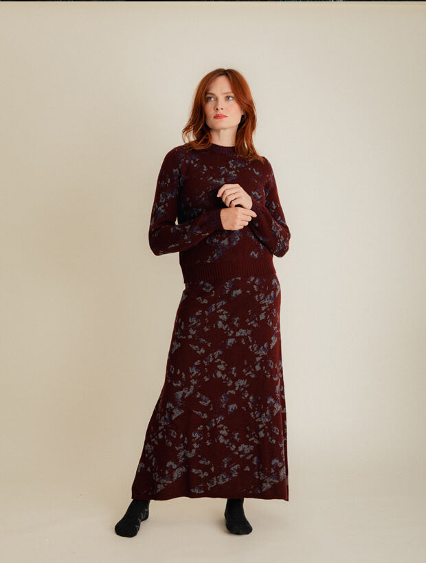 Crafted in the UK, the Lin skirt is knitted in soft, fine Scottish spun lambswool with a two-colour jacquard design in deep burgundy and grey melange, intricately knitted with regenerative viscose in sparkling purple. The result is a beautifully draped, timeless silhouette that moves seamlessly from day to evening.