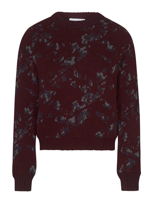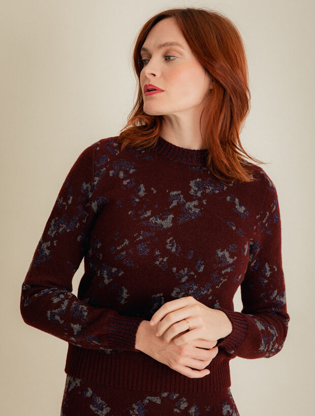 Crafted in the UK, the Lin sweater is knitted in soft, fine Scottish spun lambswool with a two-colour jacquard design in burgundy and grey melange, intricately knitted with regenerative viscose in sparkling silver. The result is a timeless silhouette that moves seamlessly from day to evening.