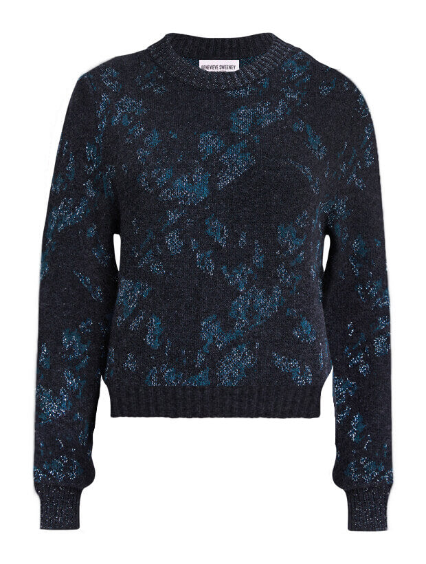 Crafted in the UK, the Lin sweater is knitted in soft, fine Scottish spun lambswool with a two-colour jacquard design in deep teal and charcoal, intricately knitted with regenerative viscose in sparkling silver. The result is a timeless silhouette that moves seamlessly from day to evening.