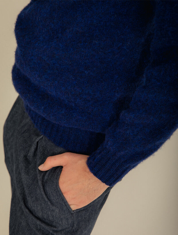 The Lunan sweater has a fully-fashioned, seamless design that not only ensures a perfect fit, but barely any yarn waste. Made in the UK, this style brings together the innovation of the seamless knitting technique and heritage skills with the brushing of the traditional Scottish spun wool.
