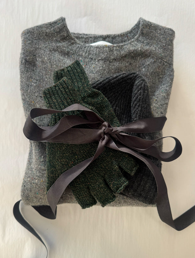 The Nethan Cosy Adventure Bundle brings together three outdoor-ready yet luxurious essentials: the Nethan Wool Tweed Sweater in grey melange, paired with a Charcoal Melange Ribbed Lambswool Beanie and our new lambswool green tweed fingerless gloves.