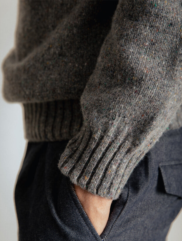 Genevieve creates the Nethan’s textural yarn through a carefully balanced and truly unique grey melange with a flurry f colourful donegal.
