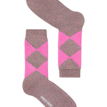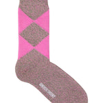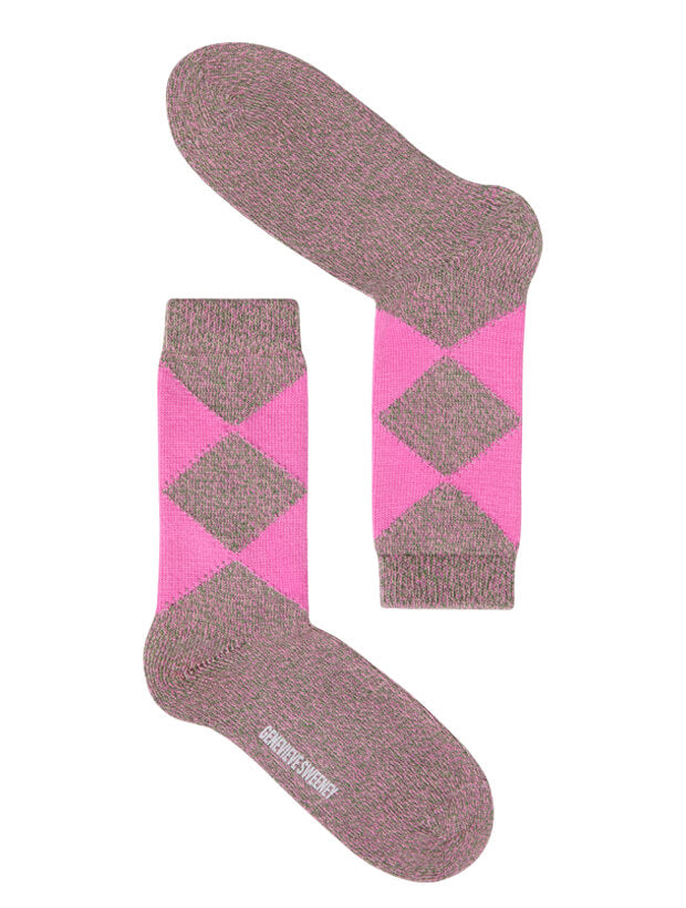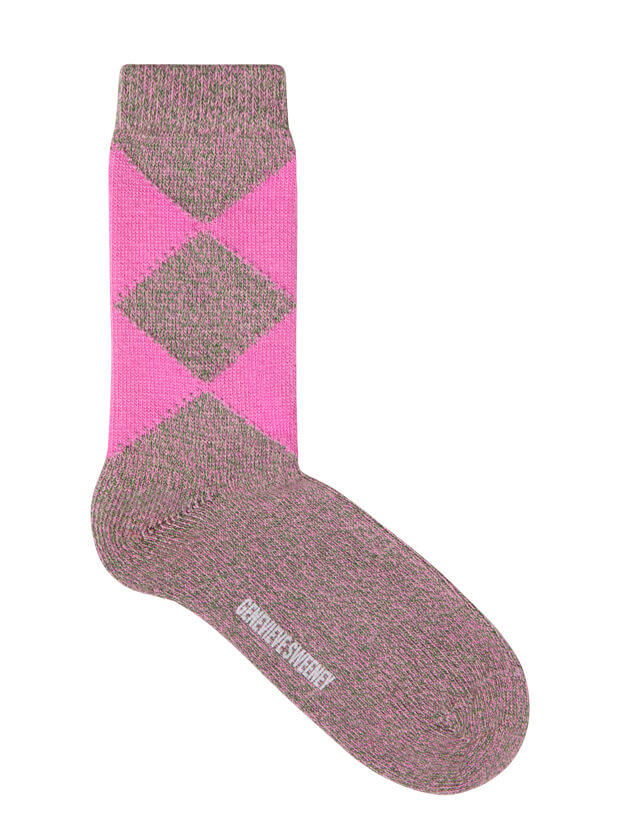 Made from soft, organic GOTS-certified cotton, these socks are custom-spun by Genevieve herself to create a selection of totally unique colour blends – in this case, light pink, sage green and off white melange with a striking pink argyle pattern.