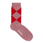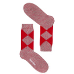 A fresh, vibrant twist to an iconic design, with a bright red colour block argyle pattern. Our Samar organic cotton argyle sock is where heritage British manufacturing and contemporary design meet. Crafted by twisting together discontinued end-of-line yarns, the result is a stylish blend of eye-catching, innovative and completely unique colour combinations of bright red and mint green marl.