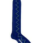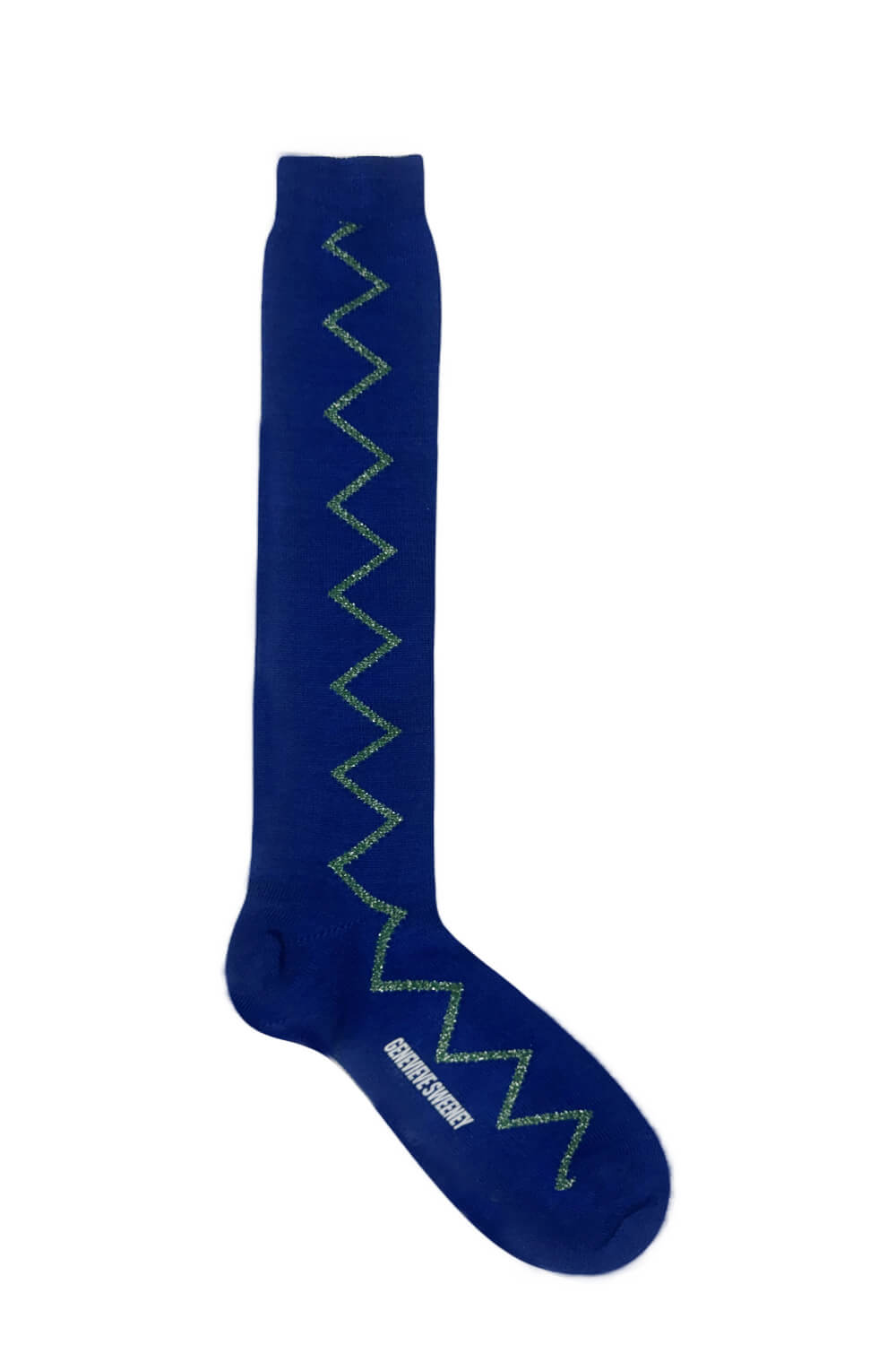 Crafted from incredibly soft and cosy merino wool in a vibrant blue paired with a zig-zag sparkle of bright green lurex, the Sia knee-high socks add a stylish twist to your daily outfit. Wear them beneath jeans or skirts instead of tights to keep your legs warm during the colder months. The zig-zag design is created by an innovative new twist on traditional hand-intarsia processes, true to Genevieve’s slow fashion ethos.