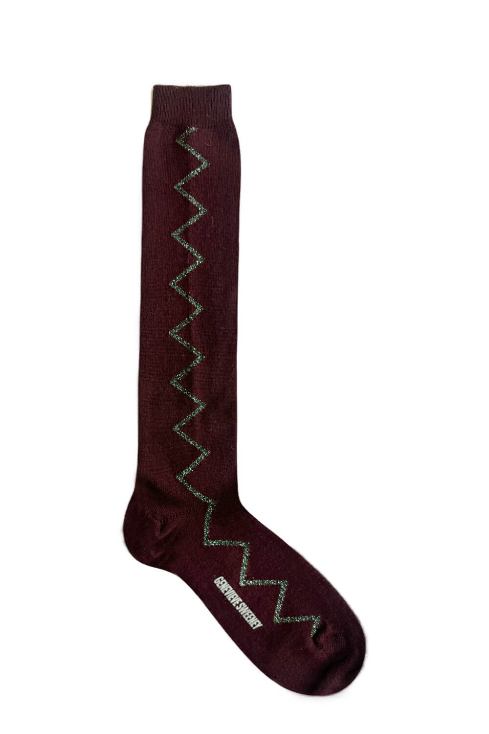 Crafted from incredibly soft and cosy merino wool paired with a zig-zag sparkle of silver khaki lurex, the Sia knee-high socks add a stylish twist to your daily outfit. Wear them beneath jeans or skirts instead of tights to keep your legs warm during the colder months. The zig-zag design is created by an innovative new twist on traditional hand-intarsia processes, true to Genevieve’s slow fashion ethos.