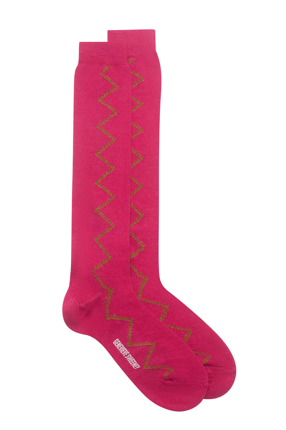 Crafted from incredibly soft and cosy merino wool in a bright pink paired with a zig-zag sparkle of vibrant orange lurex, the Sia knee-high socks add a stylish twist to your daily outfit. Wear them beneath jeans or skirts instead of tights to keep your legs warm during the colder months. The zig-zag design is created by an innovative new twist on traditional hand-intarsia processes, true to Genevieve’s slow fashion ethos.