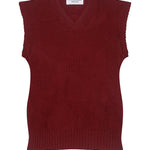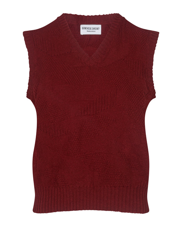 Genevieve crafts the Soar v-neck knitted vest in a deep, earthy spiced red.