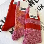 Knitted into the most beautiful sock by twisting together the softness and durability of merino wool with the luscious and warmth of Yorkshire spun alpaca. These socks are custom-spun by Genevieve herself to create a selection of unique colour blends; in this case, a bright pink merino wool with natural alpaca finished with vibrant orange merino wool with natural alpaca.