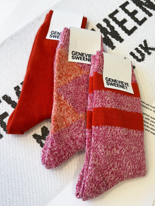 Our bestselling, thoughtful, and unique sock gift set for her- perfect for special occasions, birthdays, and Christmas. This set of three of our best-selling Salpaka socks, featuring the Salpaka Argyle and Serin merino wool, is presented in a stylish GS gift box, ready for gifting. This gift set includes one pair of plain serino merino wool socks, one pair of alpaca merino wool marl socks in pink with orange stripes and one pair of alpaca merino wool marl argyle socks in pink and orange marl.