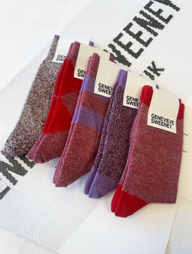Beautifully presented in a premium gift box, it’s ready to send directly to the recipient or to be given in person. The set includes, one Lilac Merino Wool Marl Socks, one Red Merino Wool Marl Socks, one Red Merino Wool Marl Argyle Socks, one Red and Lilac Merino Wool Marl Stripe Socks & Burgundy Merino Wool Alpaca Socks with Lilac Tipping
