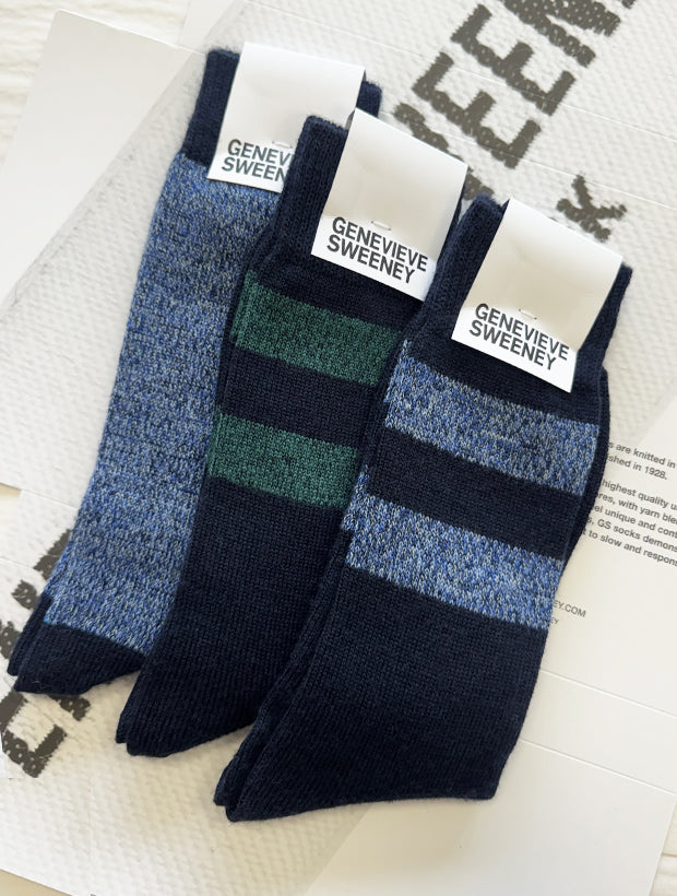 A stylish trio of socks makes an excellent gift for a special occasion and the festive holiday season. This set of three of our best-selling Samar merino wool socks and Samar socks in navy blue with contrast marl stripe is presented in a stylish GS gift box, ready for gifting. The Samar socks are crafted by twisting together discontinued and end-of-line yarns.