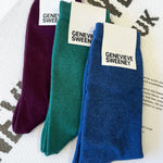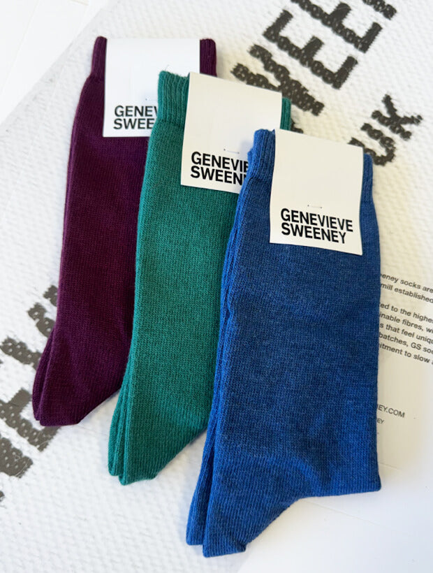 A stylish trio of socks makes an excellent gift for Christmas and special occasions. This set of three of our best-selling Sotto socks in soft organic cotton is presented in a stylish GS gift box, ready for gifting and going straight under the Christmas tree. This thoughtful gift set includes one pair of plain deep purple, jade and denim blue melange