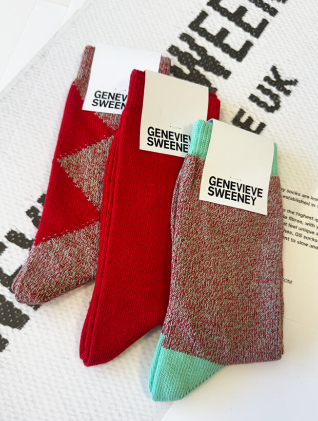A stylish trio of red socks makes an excellent gift for Christmas and special occasions. This set of three of our new Samar organic cotton marl in red and mint green, Samar organic cotton argyle socks and the bestselling solid red Sotto socks in soft organic cotton is presented in a stylish GS gift box, ready for gifting and going straight under the Christmas tree.