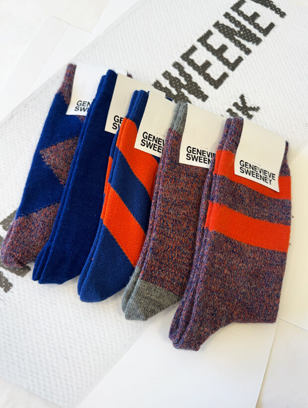 A sartorial set of five socks makes an excellent gift for a special occasion. This set of our best-selling Samar socks in merino wool marl and the Serora organic cotton sock is presented in a stylish GS gift box, ready for gifting, whether directly to the recipient or gifting in person. This gift set includes one pair of merino wool marl socks, one pair of plain fine merino wool bright blue, one merino wool marl argyle socks, one merino wool marl stripe socks and one pair of organic cotton spiral stripe in bright blue and orange.