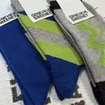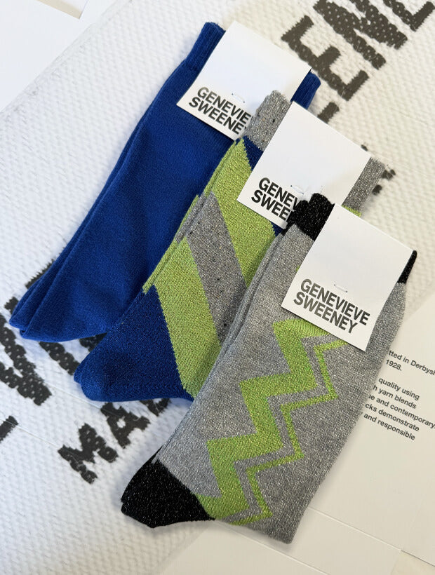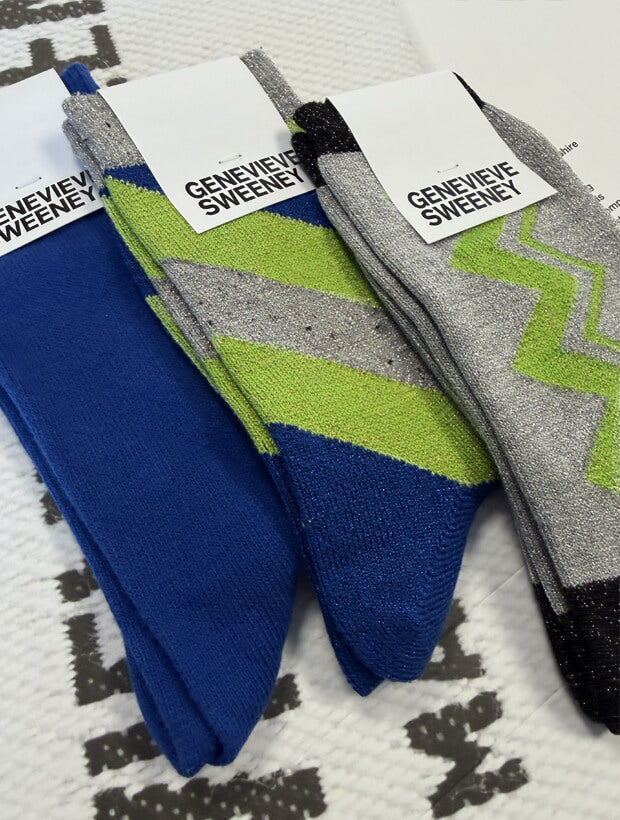 A stylish trio of British-made sparkly socks makes a luxury and thoughtful gift for a special occasion. This set of three of our luxurious soft and sparkly Serora and Sigi socks with the Sotto organic cotton socks is presented in a stylish GS gift box, ready for gifting. This gift set includes one pair of Serora sparkly socks in silver, lime green and bright blue, one pair of sparkly Sigi socks in silver, and one pair of Sotto organic cotton in bright blue.