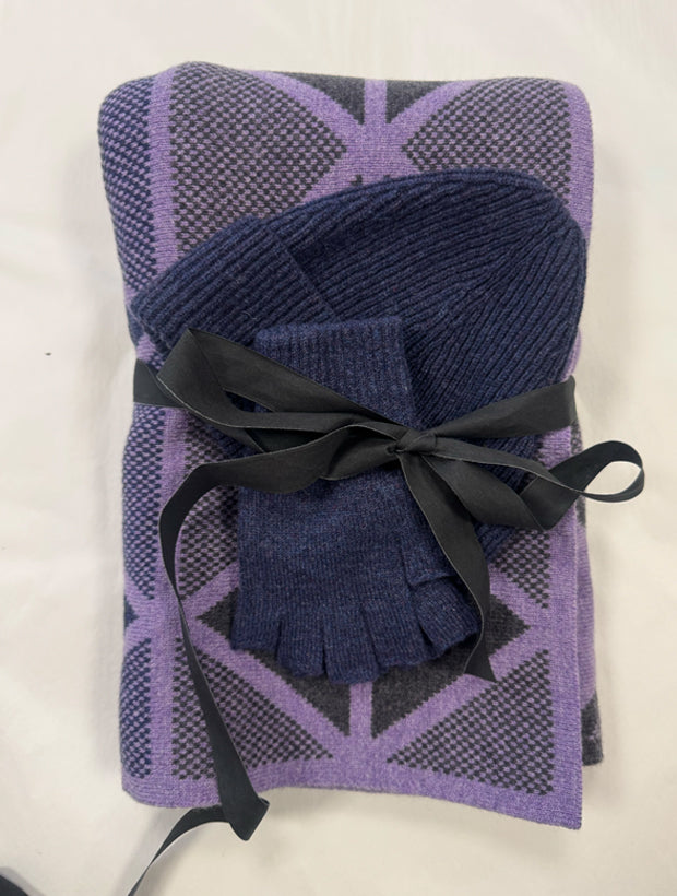 The Winter Cosy Lambswool Lilac Bundle brings together three essential cold-weather pieces: our Geometric Lambswool Oversized Scarf in Lilac Fingerless Gloves, and Beanie in Ink blue.
